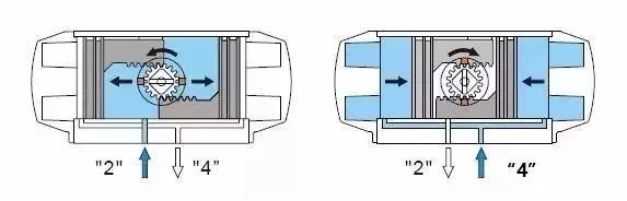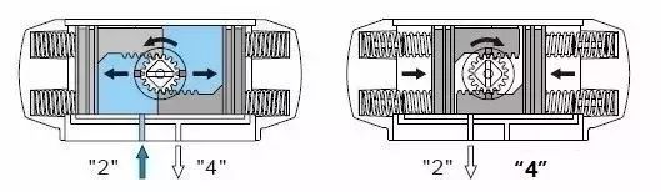 當氣源壓力從氣口(2)進入氣缸兩活塞之間中腔時,使兩活塞分離向氣缸兩端方向移動,迫使兩端的彈簧壓縮,兩端氣腔的空氣通過氣口(4)排出,同時使兩活塞齒條同步帶動輸出軸(齒輪)逆時針方向旋轉。在氣源壓力經過電磁閥換向后,氣缸的兩活塞在彈簧的彈力下向中間方向移動,中間氣腔的空氣從氣口(2)排出,同時使兩活塞齒條同步帶動輸出軸(齒輪)順時針方向旋轉。(如果把活塞相對反方向安裝,彈簧復位時輸出軸即變為反向旋轉)。g7H般德閥門