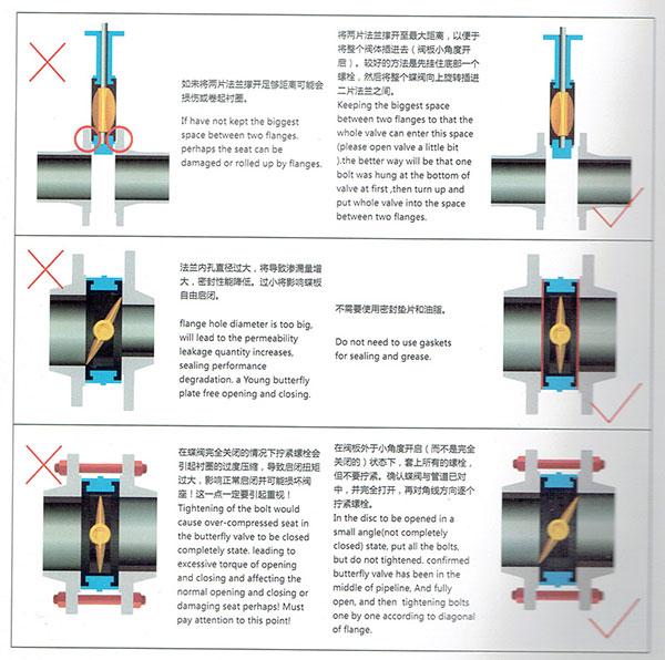 3、在蝶閥完全關(guān)閉的情況下擰緊螺栓會引起襯圈的過度壓縮,導致啟閉扭矩過大,影響正常啟閉并可能損壞閥座!