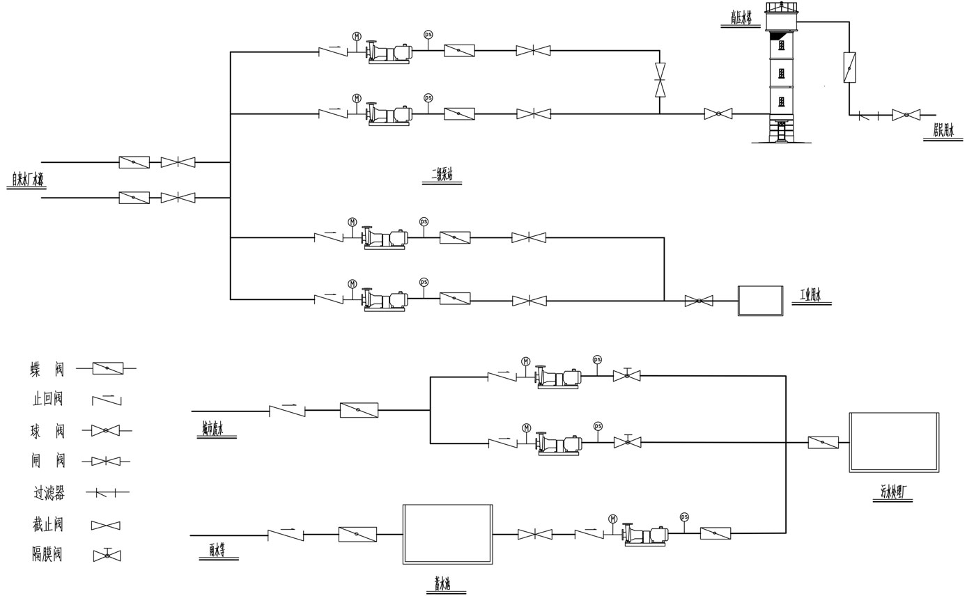 將從自來水廠處理過的清水,輸引配送到用水區(qū),供用戶使用,主要由二級泵站、輸水管道、配水管網(wǎng)、水塔等幾部分構(gòu)成。